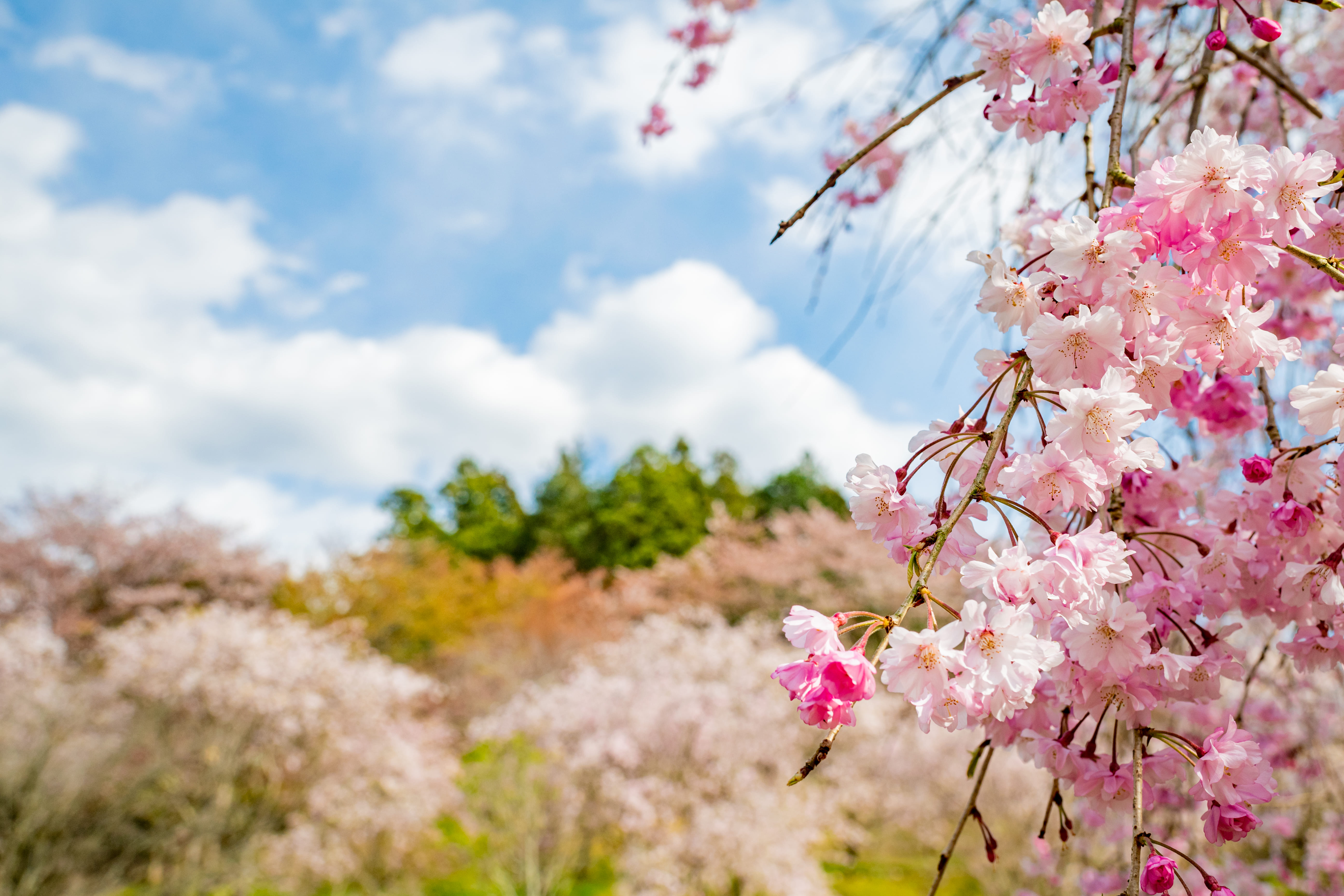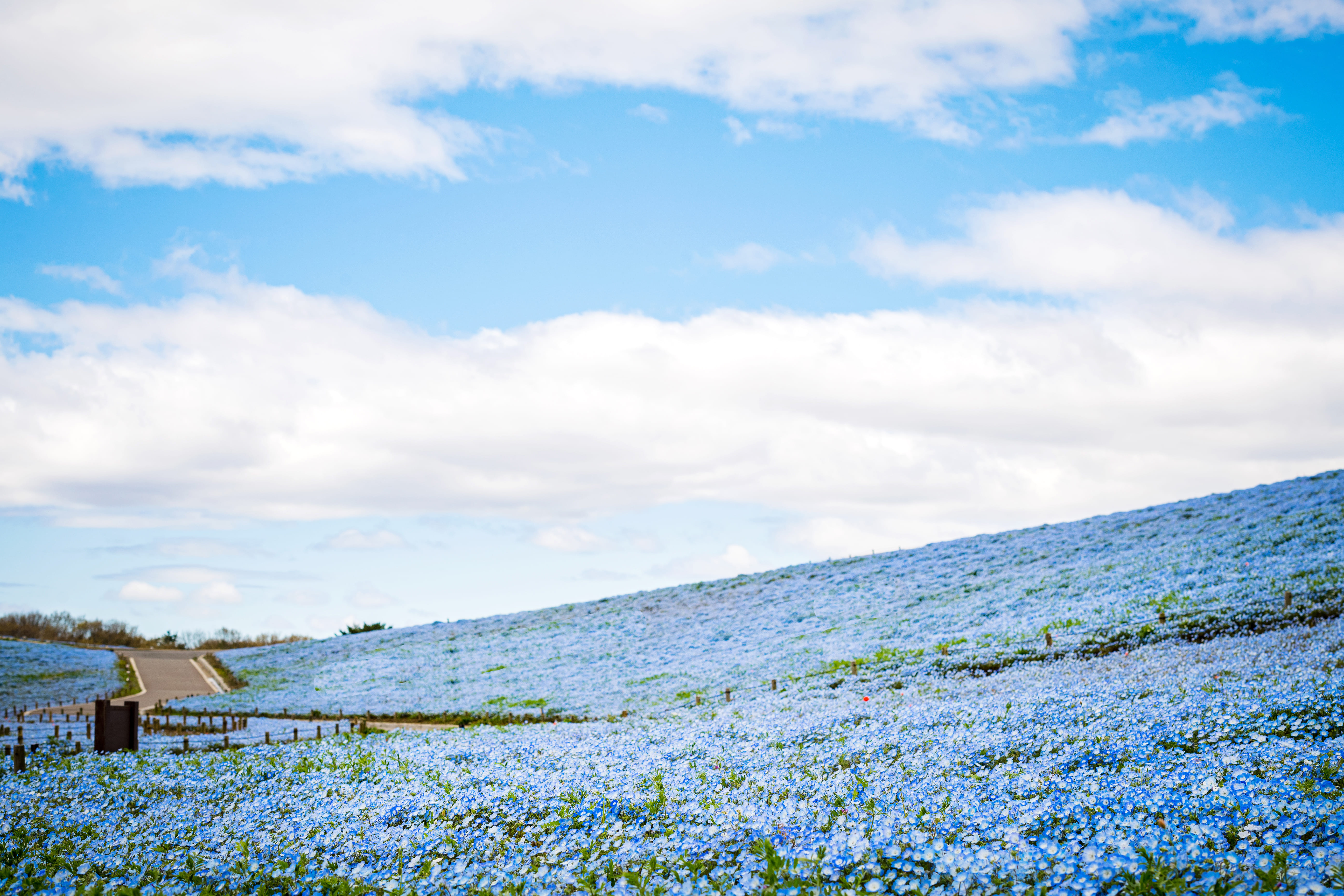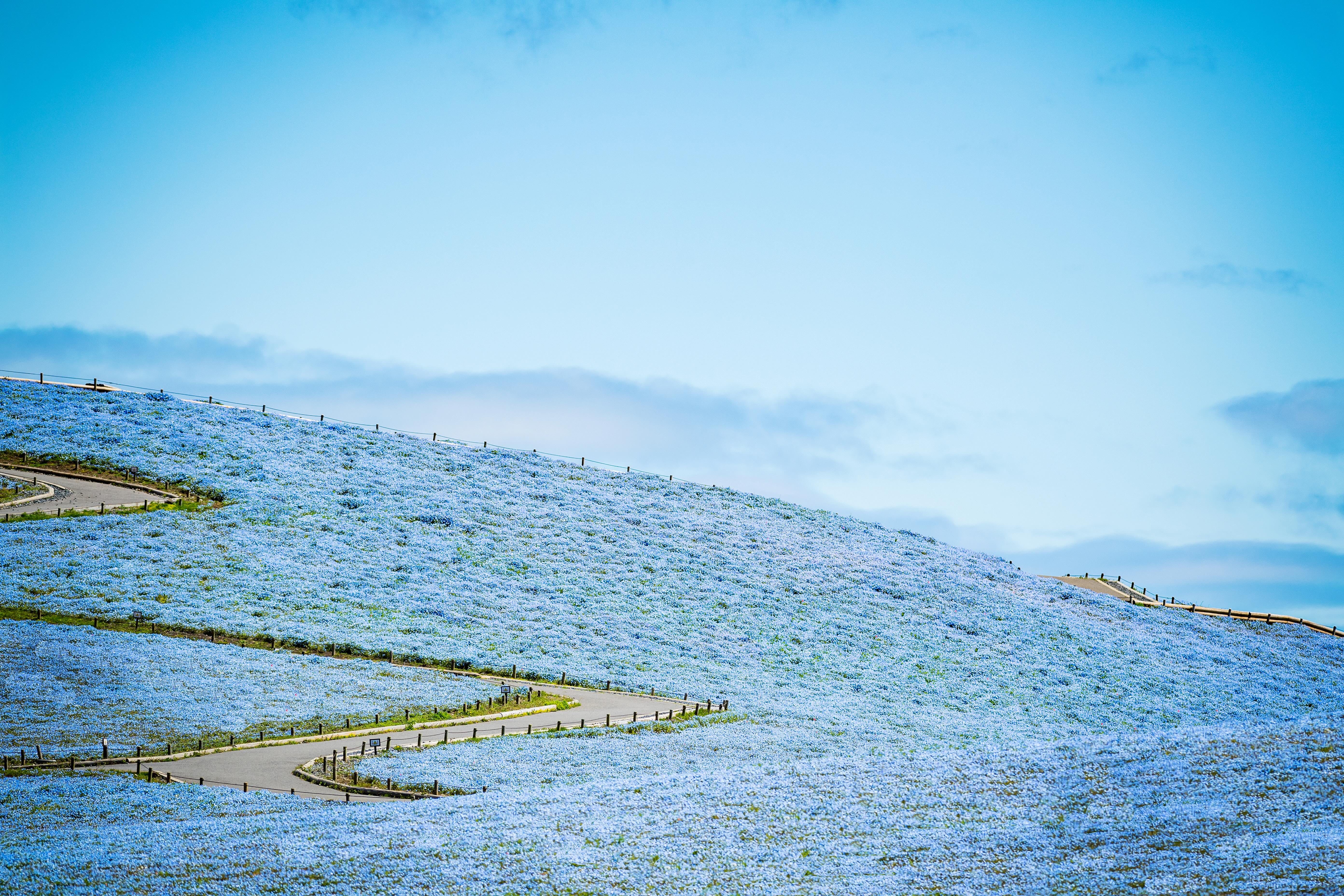 · Pink Butterfly Sea:Witness the breathtaking "Sea of Pink Butterflies," where millions of nemophila (baby blue eyes) flowers carpet the landscape in a soft, mesmerizing shade of pink and blue.
