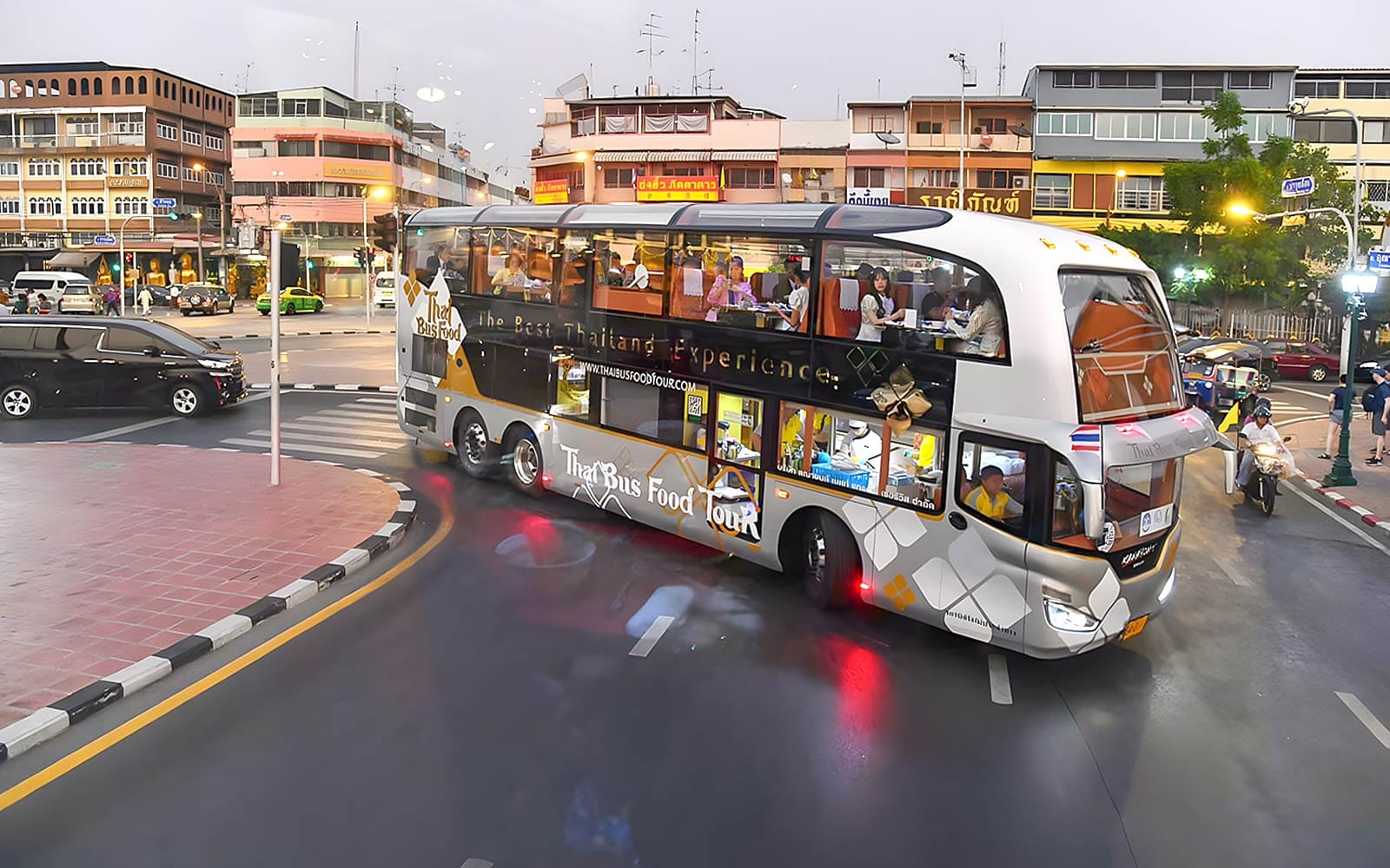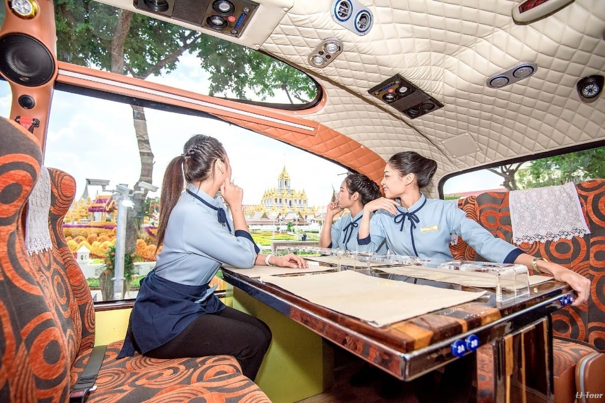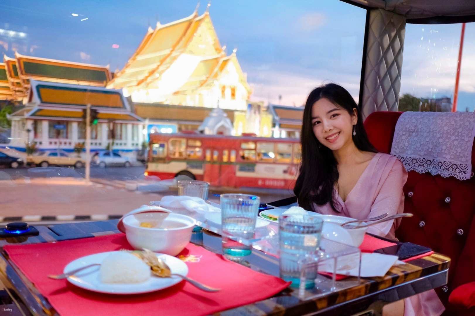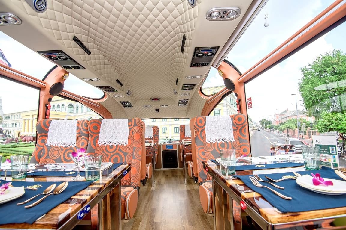 Indulge in Bangkok's grandeur aboard the Thai Bus Food Tour - a luxurious double-decker bustaurant offering gourmet Thai cuisine and curated city views, all enhanced by expert commentary and impeccable comfort.