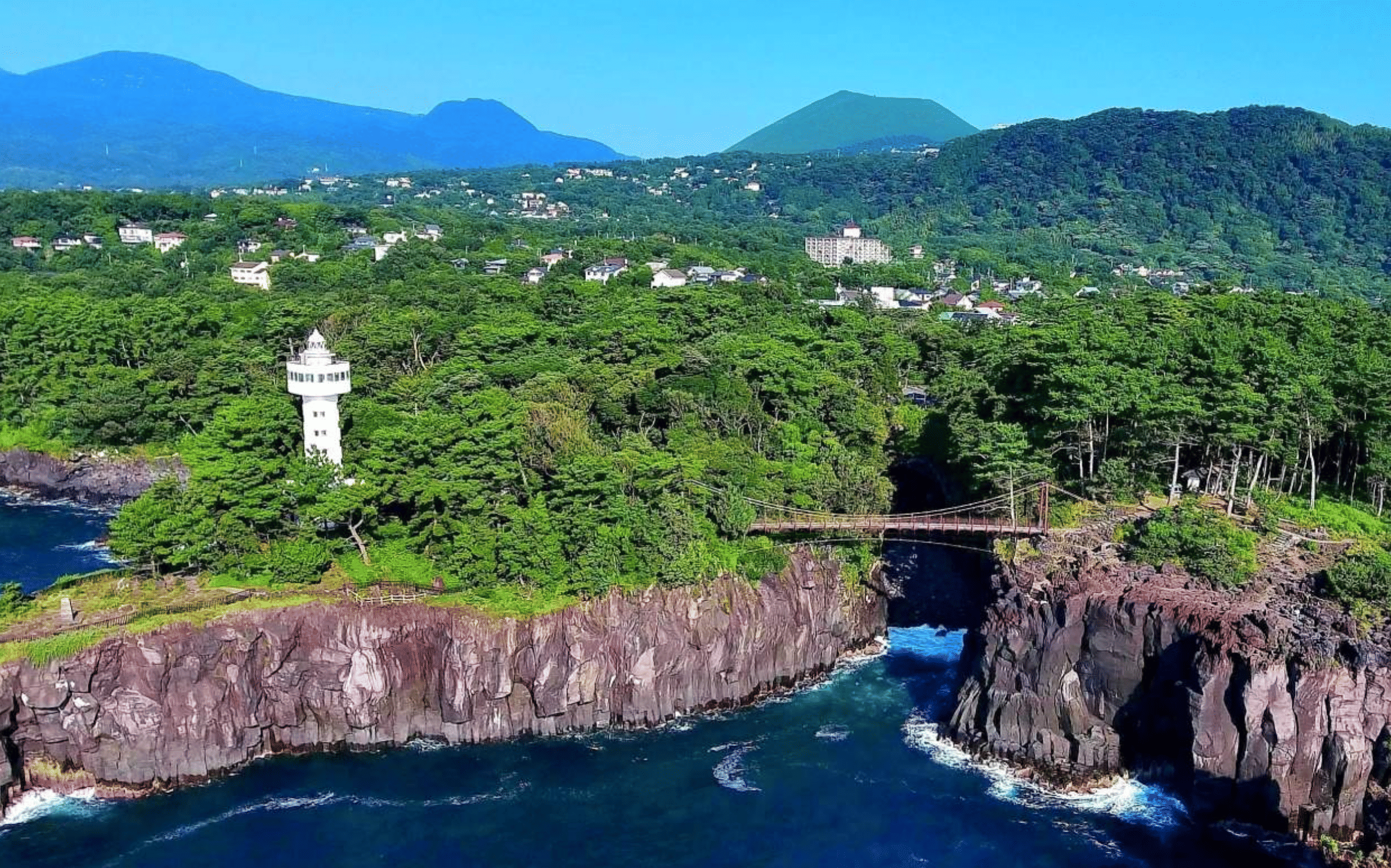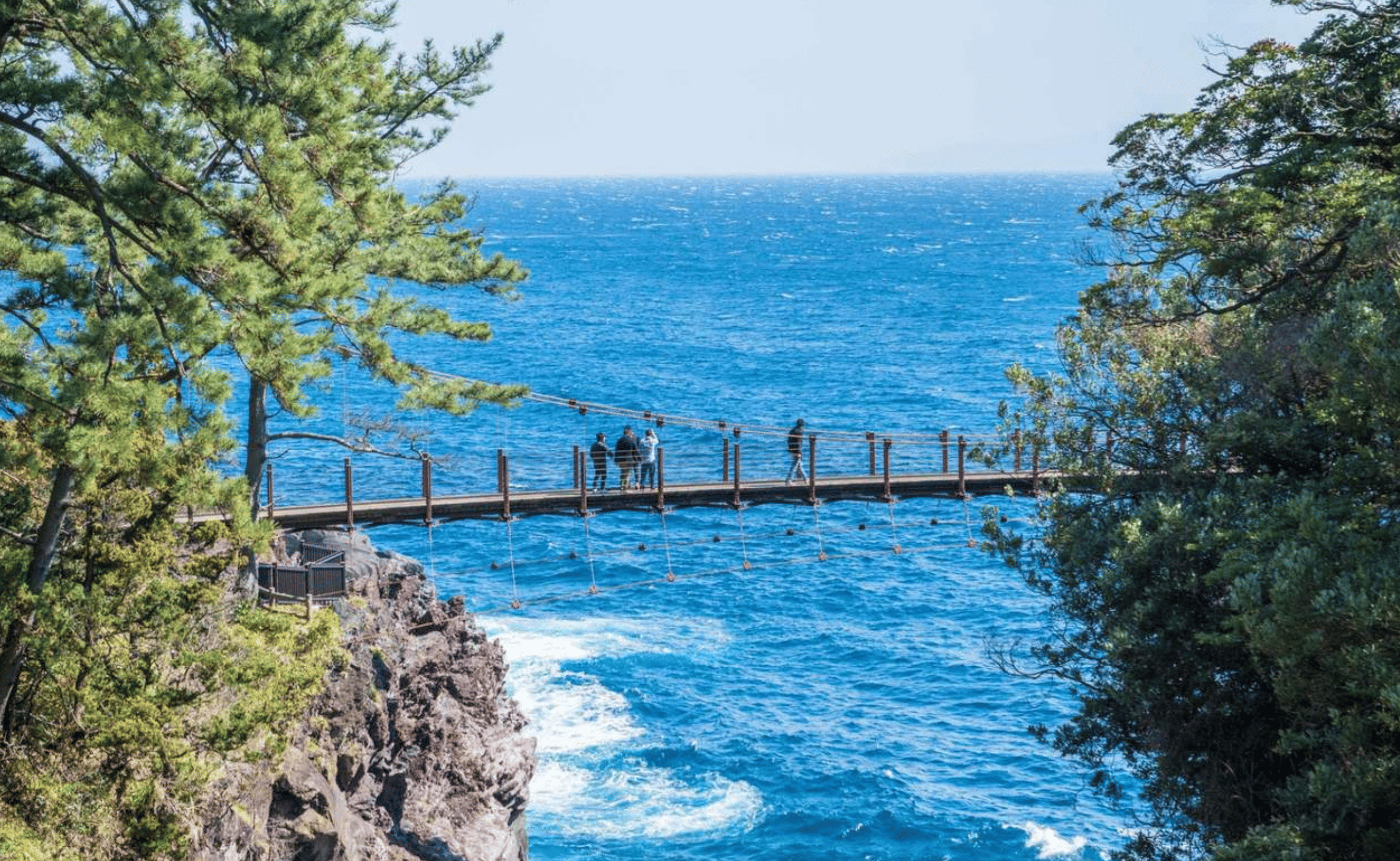 Finally, we head to the dramatic Jogasaki Coast, a wild gallery carved by the cooling lava flow from Mt. Omuro. Witness the powerful ocean as waves crash against 30-meter-high black cliffs. The climax of the coast is the Kadowaki Suspension Bridge: a narrow, 48-meter-long bridge spanning a dangerous canyon 23 meters above the deep blue trench, offering an exhilarating walk "on the waves in the air."