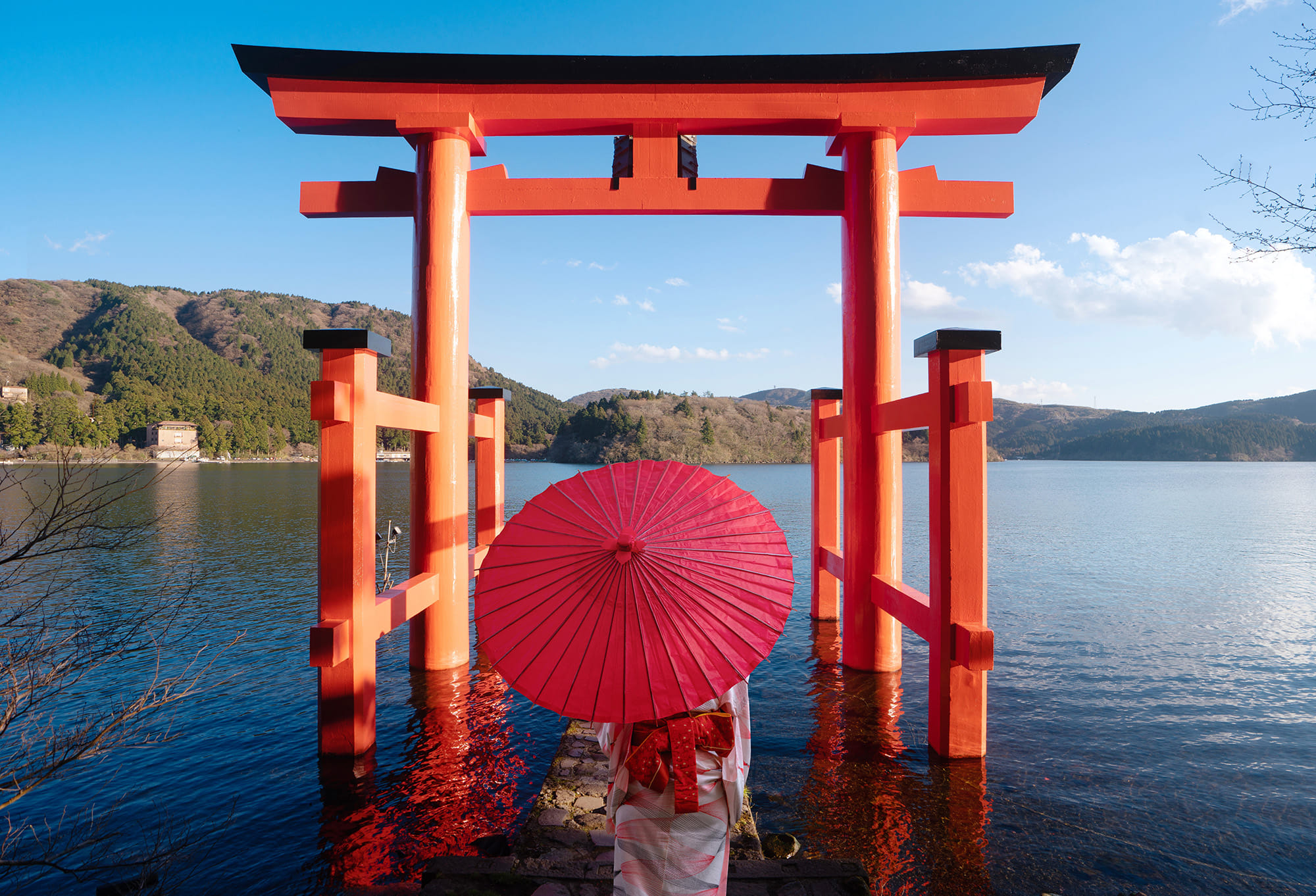 1. Hakone Shrine and Lake Ashi:Begin your adventure with a visit to the tranquil shores of Lake Ashi. Here, you will see the iconic Hakone Shrine, with its sacred torii gate seemingly floating on the water. Take your time to capture stunning photos of the torii and the magnificent silhouette of Mount Fuji reflected in the lake's calm surface.